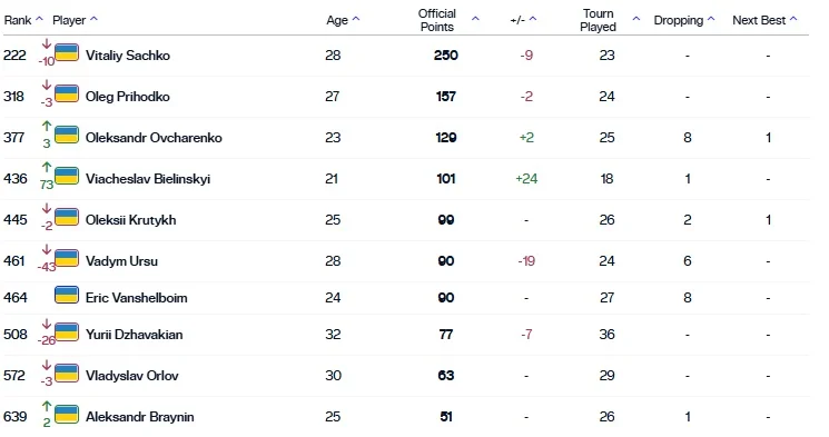 Олег Приходько опустился на три позиции и идет 318-м в рейтинге АТР, Александр Овчаренко зато поднялся на три позиции и стал 377-м. В пятую сотню ворвался 21-летний Вячеслав Белинский, который выиграл 25-тысячник в Оллерсбахе. Молодой теннисист расположился на 436-м месте.