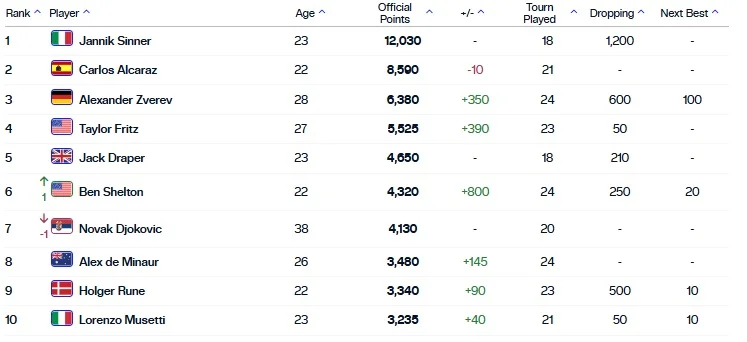 Итальянец Янник Синнер продолжает возглавлять рейтинг Ассоциации теннисистов-профессионалов. В первой десятке произошла одна замена – американец Бен Шелтон поднялся с седьмого места на шестое. Для него это рекордная позиция в карьере.
