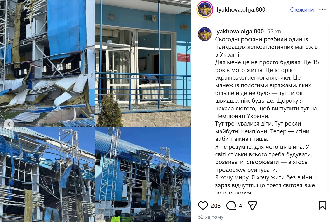"Сегодня россияне разбили один из лучших легкоатлетических манежей в Украине. Для меня это не просто здание. Это 15 лет моей жизни. Это история украинской легкой атлетики. Это манеж с пологими виражами, которых больше нигде не было – здесь ты бежал быстрее, чем где-либо.
