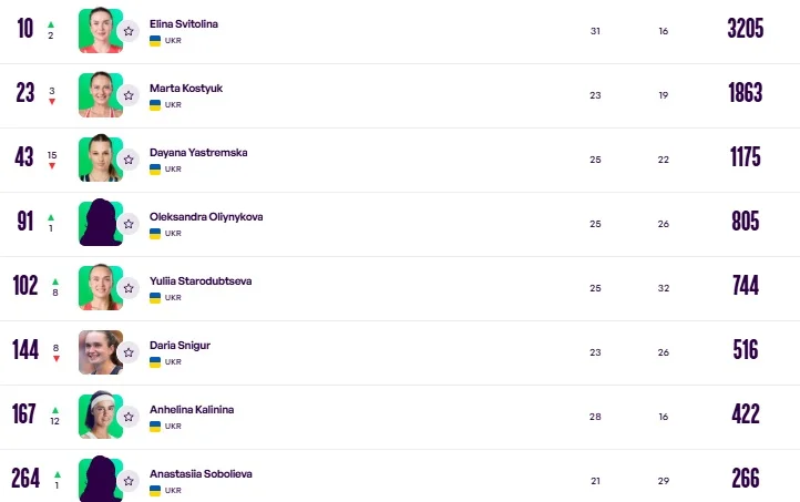 Первая ракетка Украины Элина Свитолина благодаря своим удачным выступлениям поднялась на две ступеньки и впервые с октября 2021 года попала в топ-10. Марта Костюк и Даяна Ястремская потеряли позиции после раннего вылета с Australian Open. Марта опустилась на 23 место, а Даяна "упала" с 28-й строчки аж на 43-ю.