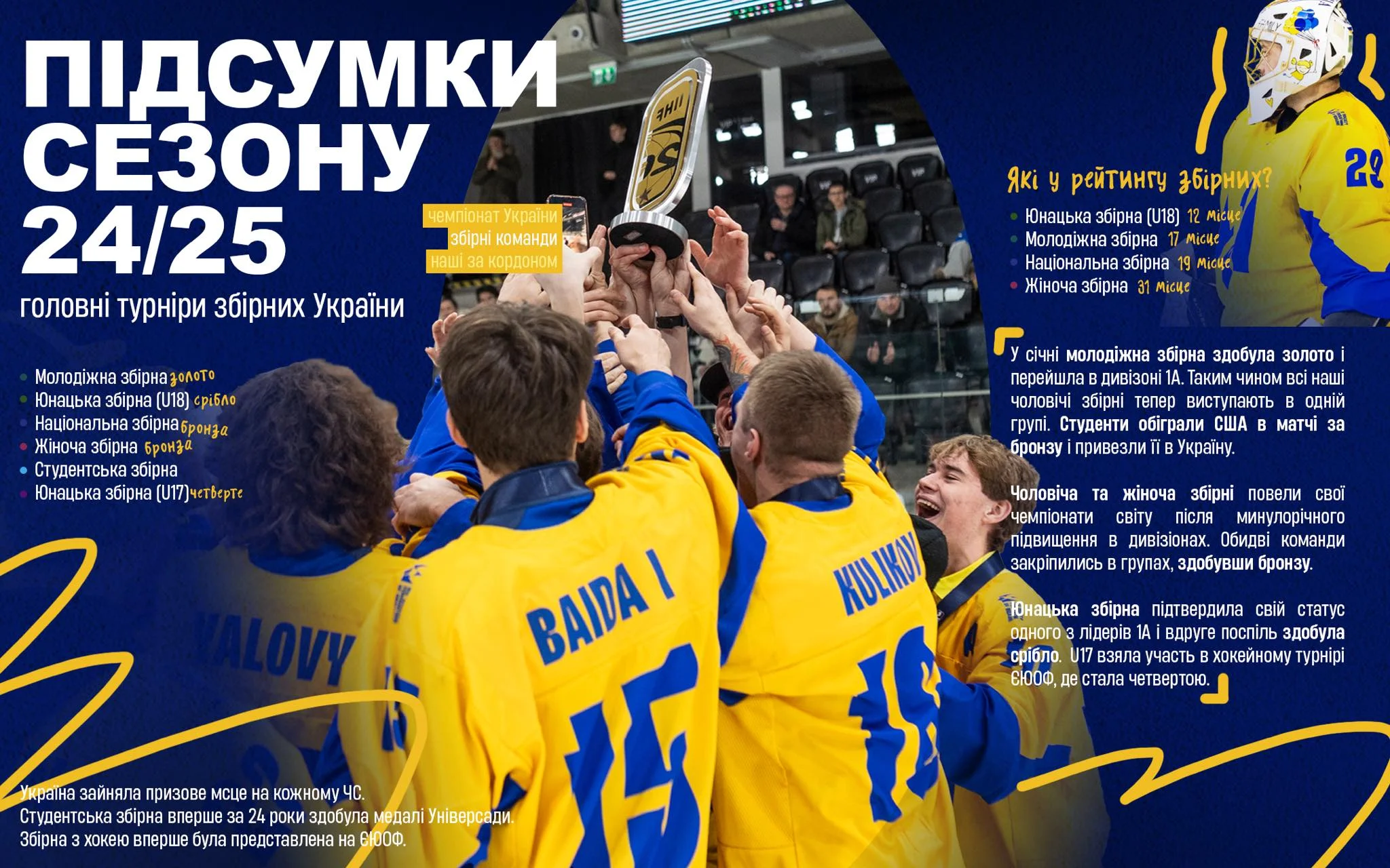 Заметим, что в обновленной версии реестров IIHF юношеская сборная Украины U-18 занимает 2-е место, а молодежная команда U-20 идет на 17-й позиции. Женская сборная Украины, в свою очередь, занимает в мире 31-е место.