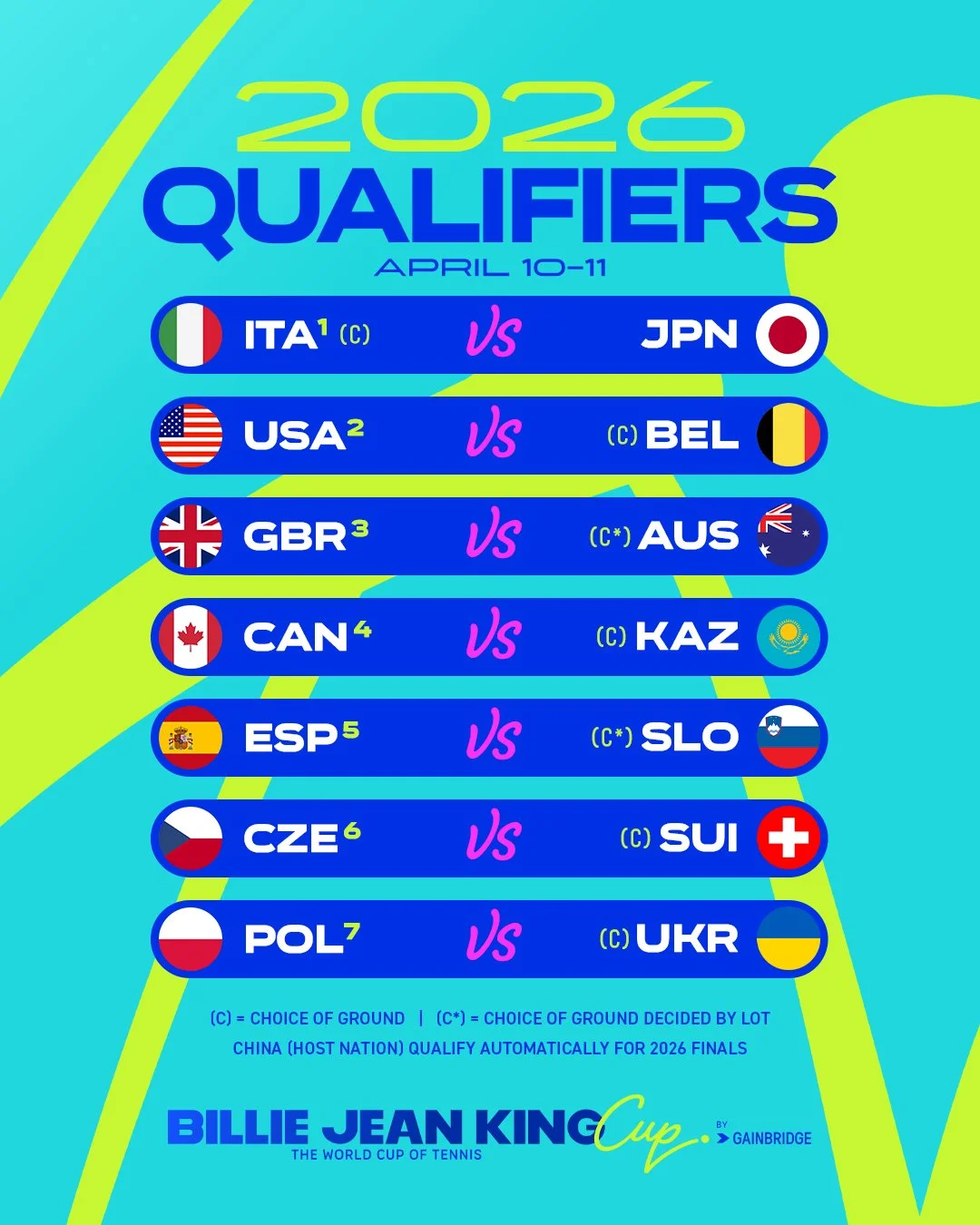 Победители встреч квалификации попадут в финал Кубка Билли Джин Кинг, где им компанию составит сборная Китая, хозяйка решающего турнира.