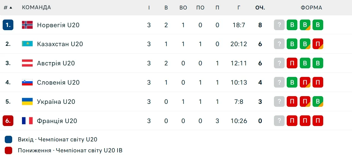 Поражение отбросило украинцев на две позиции – они были третьими, а теперь занимают предпоследнее, пятое, место. Позади них располагается только команда Франции. Она могла сотворить сенсацию в поединке против Казахстана (вела в счете 2:1 после первого периода, но в итоге проиграла 6:14), но этого, к счастью, не произошло.