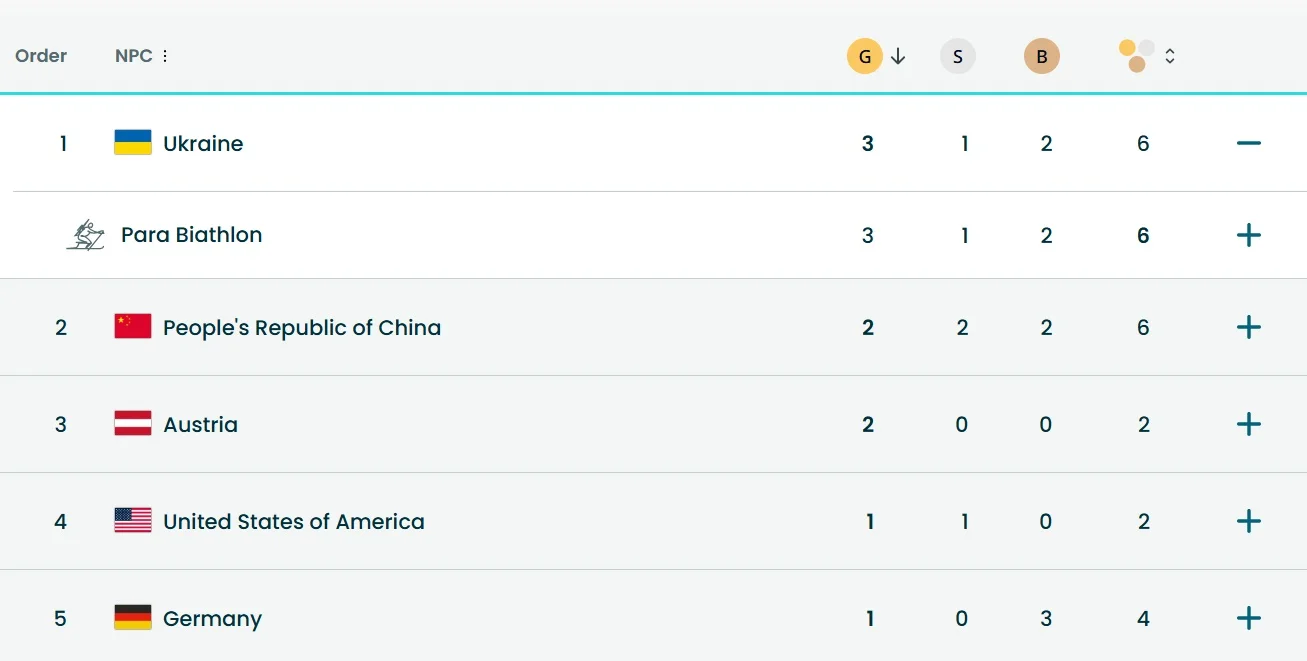 По итогам первого соревновательного дня Паралимпийских игр 2026 украинская сборная возглавила общий зачет, имея 6 медалей (три золота, одно серебро, две бронзы).