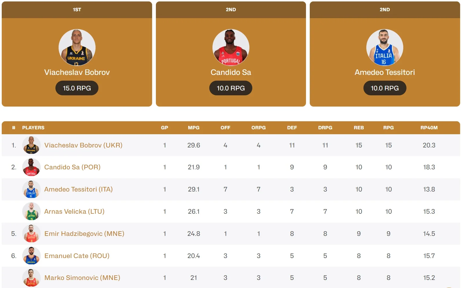 Форвард сборной Украины по баскетболу Вячеслав Бобров в матче против команды Грузии (92:79) сделал 15 подборов, что является лучшим показателем по итогам 1-го тура, сообщает FIBA.
