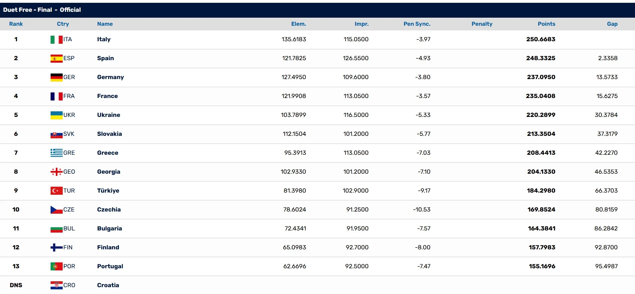 Чемпионками Европы стали представительницы Италии. Победу им принесли 250,6683 балла. Серебро завоевали синхронистки из Испании (248,3325 балла), бронзы завоевал дуэт из Германии (237,0950).