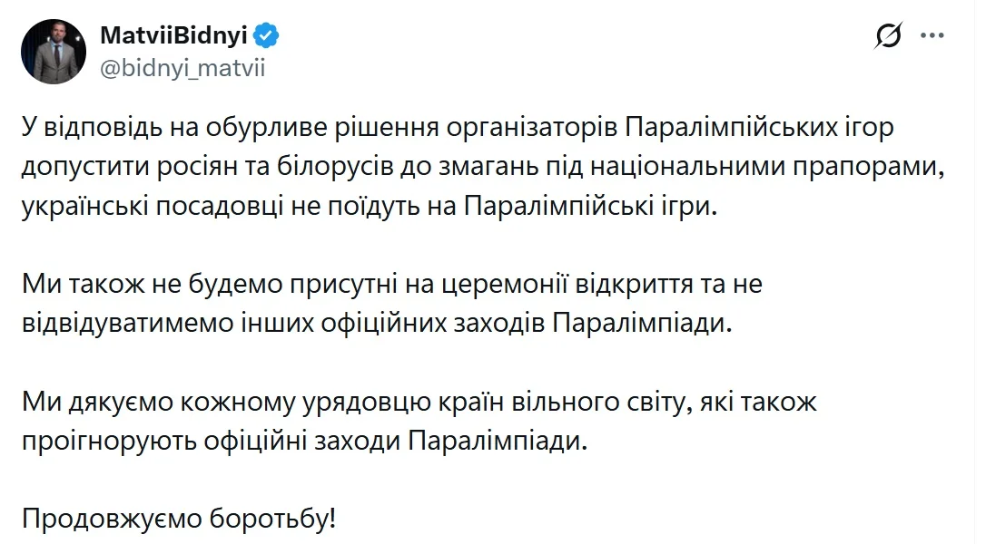 "В ответ на возмутительное решение организаторов Паралимпийских игр допустить россиян и белорусов к соревнованиям под национальными флагами, украинские чиновники не поедут на Паралимпийские игры. Мы также не будем присутствовать на церемонии открытия и не будем посещать других официальных мероприятий Паралимпиады.