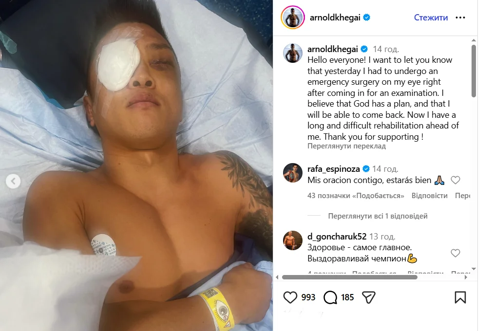 Украинский легковес Арнольд Хегай перенес срочную операцию на глазу после поражения от Рафаэля Эспиносы. Об этом 33-летний спортсмен сообщил на своей странице в социальной сети Instagram.