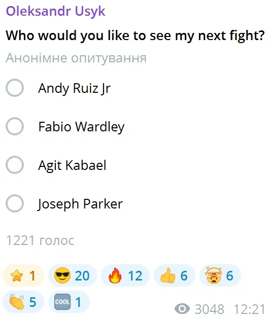 Усик в своем Telegram-канале открыл голосование для всех желающих. Украинский чемпион предложил выбрать одного боксера среди четырех, а именно – Фабио Уордли, Джозефа Паркера, Энди Руиза и Агита Кабаела.