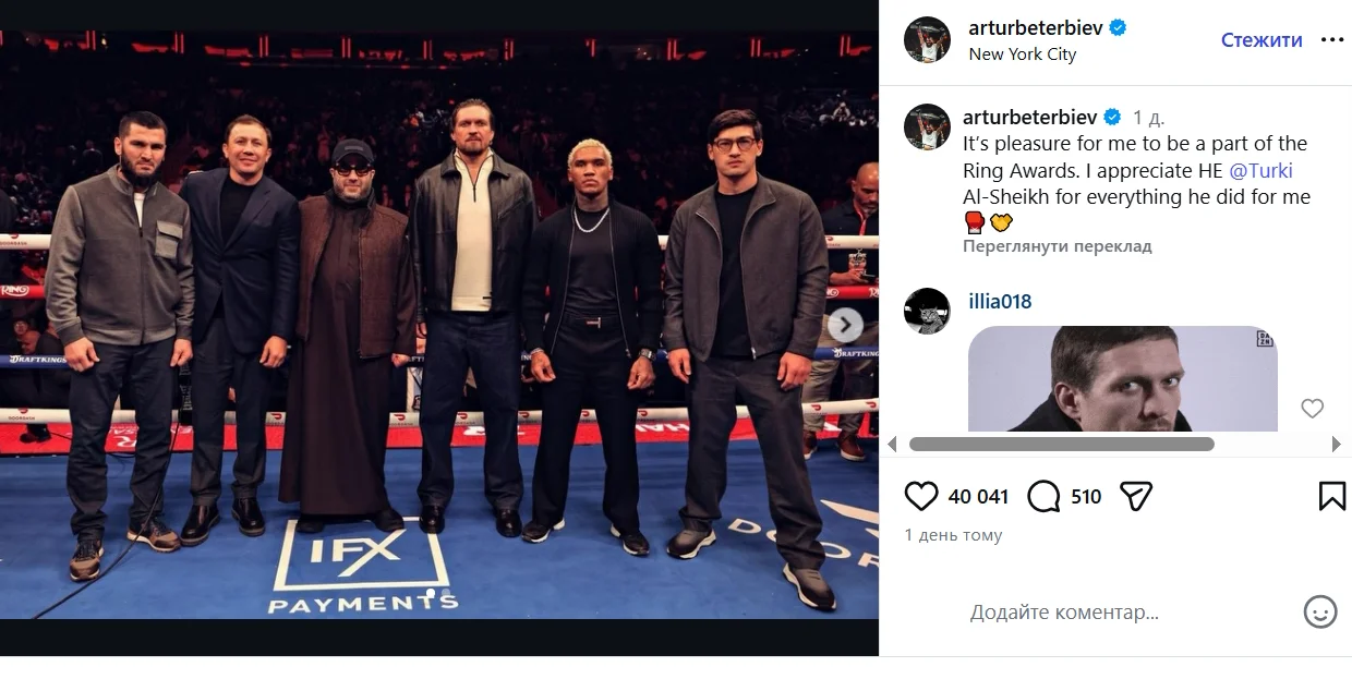 Усик старался игнорировать российских боксеров Артура Бетербиева и Дмитрия Бивола во время события. Однако на одном из фото украинца заметили в компании граждан страны-агрессора. Это фото Бетербиев опубликовал в своем Instagram.