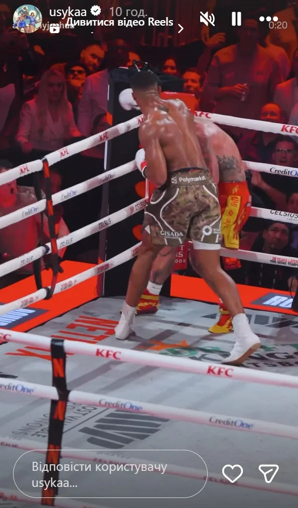 Усик в сториз Instagram разместил видео нокаута, в который Джошуа отправил Пола в 6-м раунде.