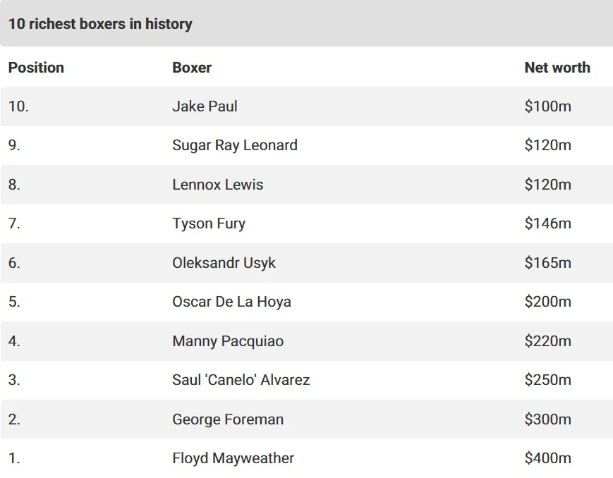 Лидирует в рейтинге непобедимый американец Флойд Мейвезер. Его заработок составляет 400 миллионов долларов. Второе и третье место заняли соответственно Джордж Форман (300 миллионов долларов) и Сауль (Канело) Альварес (250 миллионов долларов).