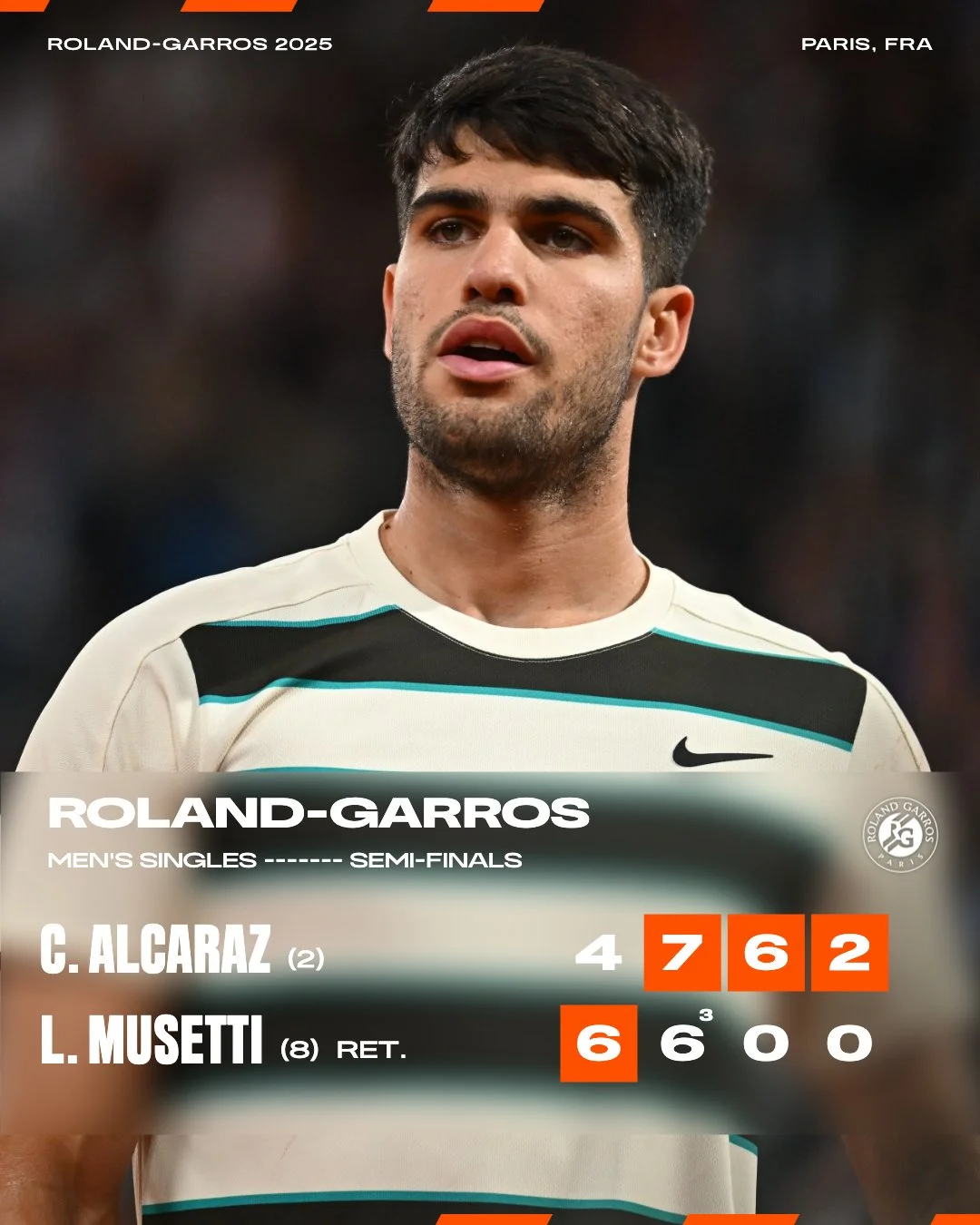 Алькарас на Ролан Гаррос вийшов у свій 25-й фінал у кар'єрі і в п'ятий на турнірах Grand Slam. За трофей у Парижі він зустрінеться або з Новаком Джоковічем, або з Янніком Сіннером.