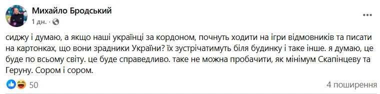 Їх зустрічатимуть біля будинку і таке інше. Я думаю, це буде по всьому світу. Це буде справедливо. Таке не можна пробачити, як мінімум, Скапінцеву та Геруну. Сором і сором", – написав Бродський на своїй сторінці у соціальній мережі Facebook.