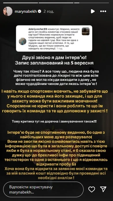 "Була двічі госпіталізована до лікарні": Бех-Романчук пояснила, чому не давала інтерв'ю після дискваліфікації