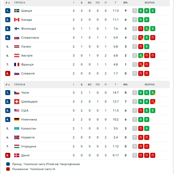 Чемпіонат світу з хокею-2025: Швеція здолала Фінляндію, Чехія розгромила Данію, завдавши їй третьої поразки поспіль