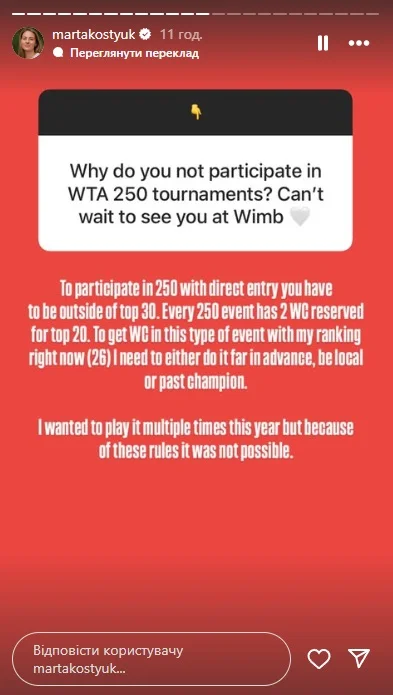 Я хотіла зіграти на таких турнірах цього року, і не один раз, але через правила це було неможливо", – заявила Марта Костюк, відповідаючи на запитання вболівальників у своєму Instagram.