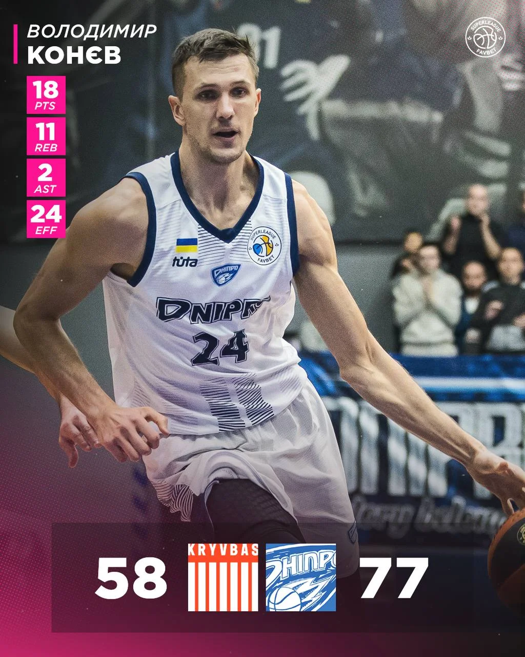 Дніпро здолав Кривбас з рахунком 77:58. Найрезультативнішим гравцем матчу став Володимир Конєв з Дніпра, який заробив 18 очок, 2 асисти та 11 підбирань.
