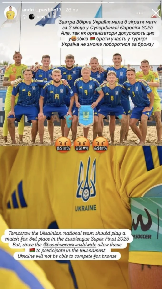 Гравець національної команди України з пляжного футболу Іван Пашко поділився новиною про те, що матч за бронзу Євроліги-2025 між українською збірною та командою Білорусі у неділю, 14 вересня, зіграний не буде.