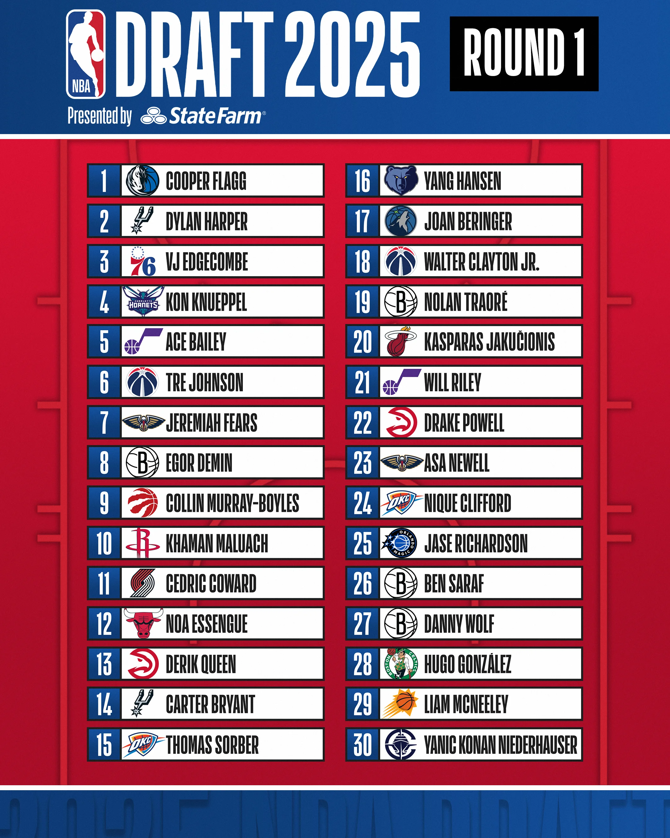 Відкривав перший раунд драфту Даллас, який переміг у лотереї з 1,8% шансу. Маверікс вирішили нічого не вигадувати, взявши під першим піком Купера Флегга, який і очікувався головним проспектом цього року.