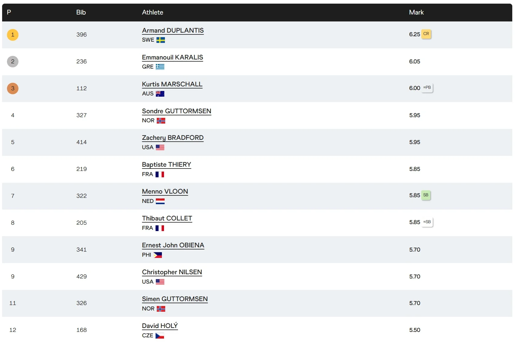 Іншими призерами чемпіонату світу в стрибках з жердиною стали Еммануїл Караліс із Греції (6.05 метра) та Кертіс Маршалл із Австралії (6.00 метра). Вперше в історії одразу троє спортсменів подолали позначку в шість метрів на одних змаганнях у приміщенні, повідомляє World Athletics.