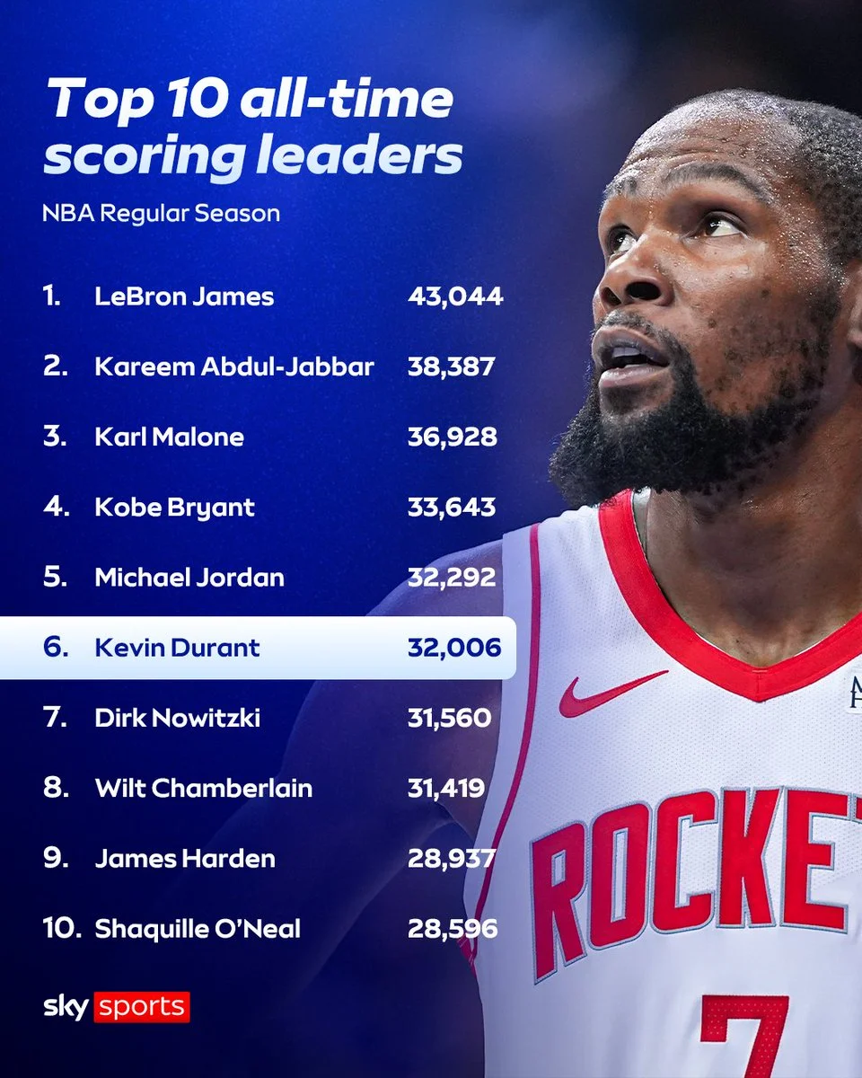 Кевін Дюрант найближчим часом може увійти у топ-5, потіснивши звідти Майкла Джордана – йому для цього треба набрати 286 пунктів.