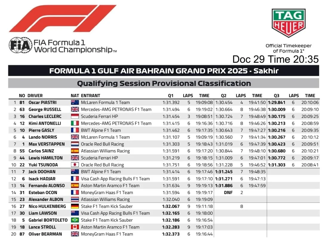 Повні результати кваліфікації гран-прі Бахрейну: