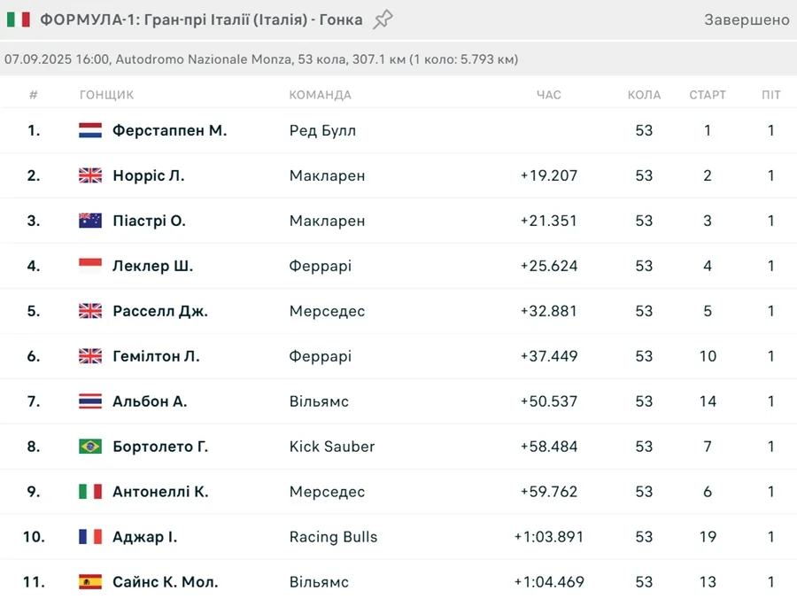 Завершився 16-й етап Формули-1 – Гран-прі Італії. Результати перегонів – у цій новині на "Футбол 24+".