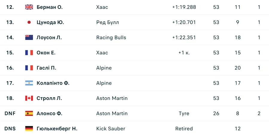 Дворазовий чемпіон Формули-1 Фернандо Алонсо з Астон Мартін достроково завершив перегони. Він достроково заїхав у бокси через поломку підвіски, а от Ніко Хюлькенберг із Заубера через технічні проблеми взагалі не зміг стартувати.