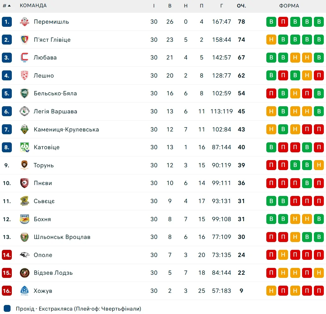Підсумкова таблиця регулярного сезону чемпіонату Польщі з футзалу