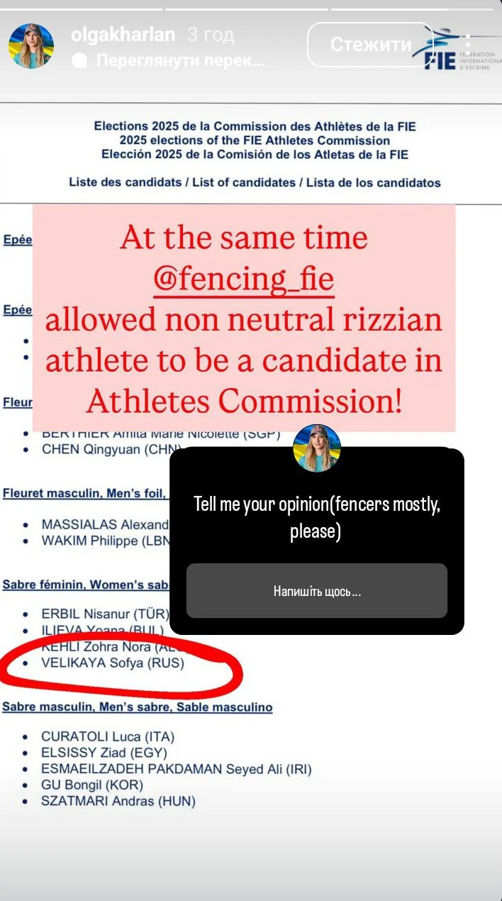 "Україна щодня бореться з російським терором! Водночас FIE дозволила не нейтральній російській спортсменці бути кандидаткою у комісію спортсменів", – написала Харлан.
