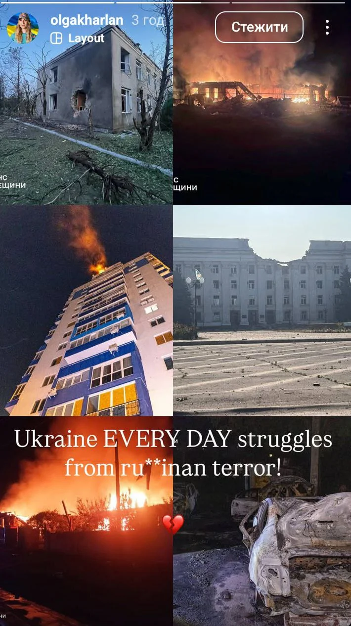 На своїй сторінці в Instagram Ольга розмістила дві світлини. На одній з них показано колаж з руйнуваннями українських міст, внаслідок ударів РФ в ніч на 5 травня. В іншому дописі українська спортсменка виклала скриншот, де Софія Велика була серед кандидатів до FIE.