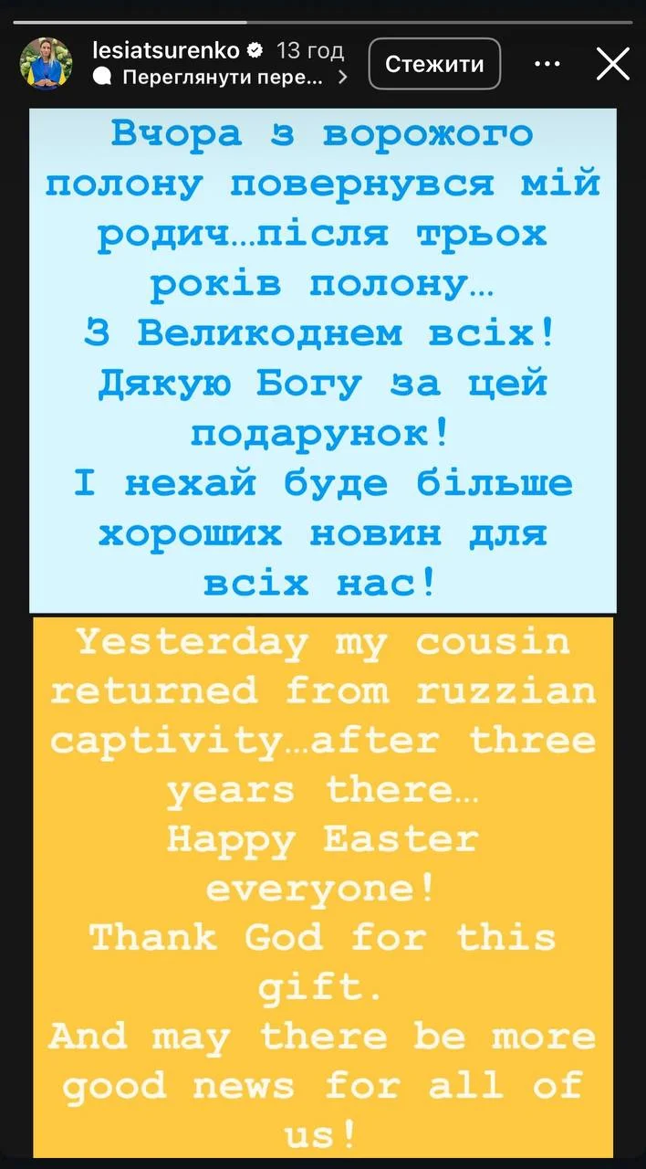"Вчора з ворожого полону повернувся мій родич... Після трьох років полону... З Великоднем усіх. Дякую Богу за цей подарунок. І нехай буде більше хороших новин для всіх нас", – написала Цуренко у своїх соцмережах.