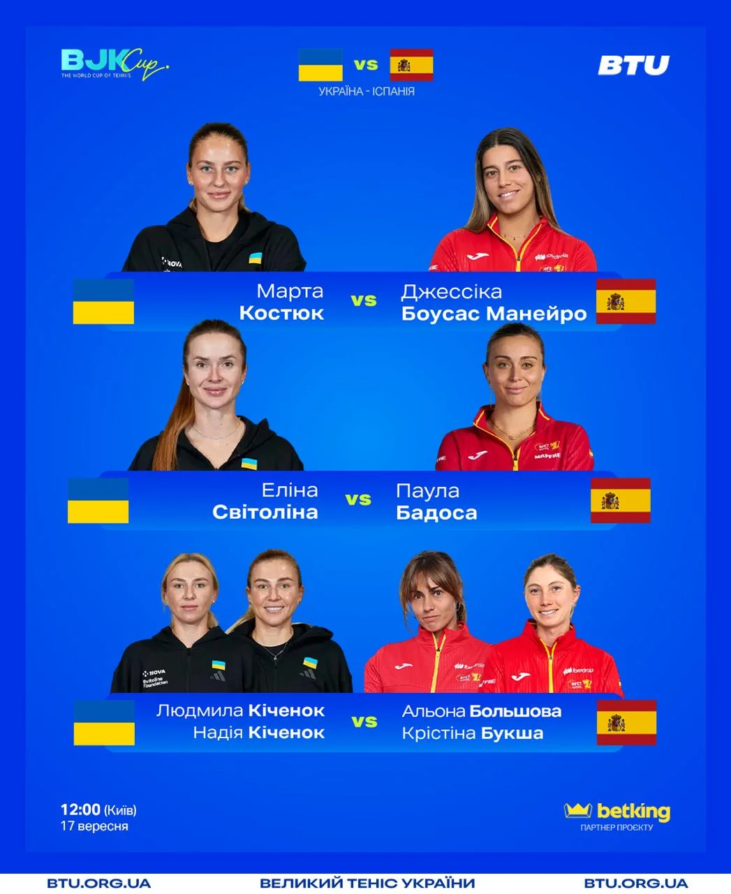 Матчева зустріч з іспанками буде складатися з трьох поєдинків – двох одиночних та одного парного. Переможець вийде до наступного раунду, де зустрінеться зі збірною Італії, яка напередодні переграла команду Китаю.