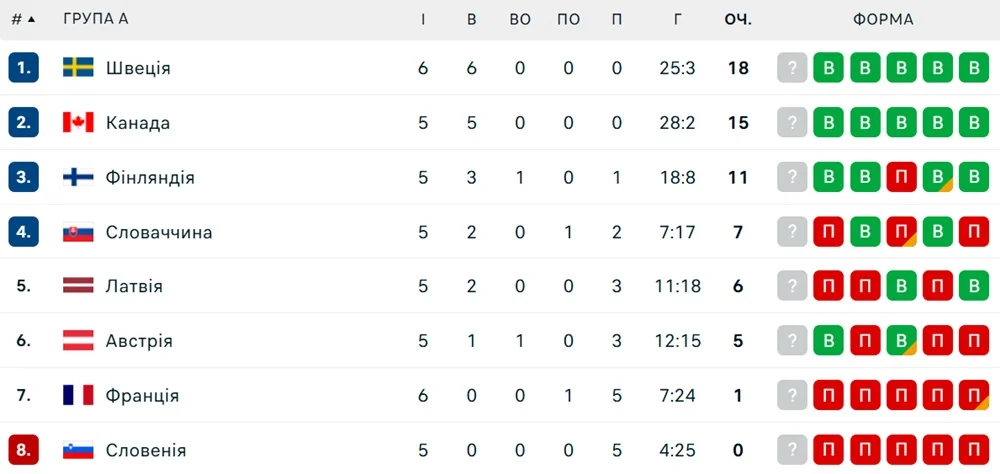 Канадці з 15 очками посідають друге місце в таблиці групи А – путівка у чвертьфінал у них вже у кишені, як і у збірної Швеції, яка лідирує (6 перемог у шести матчах). Словаччина посідає 4-ту позицію з 7 пунктами.