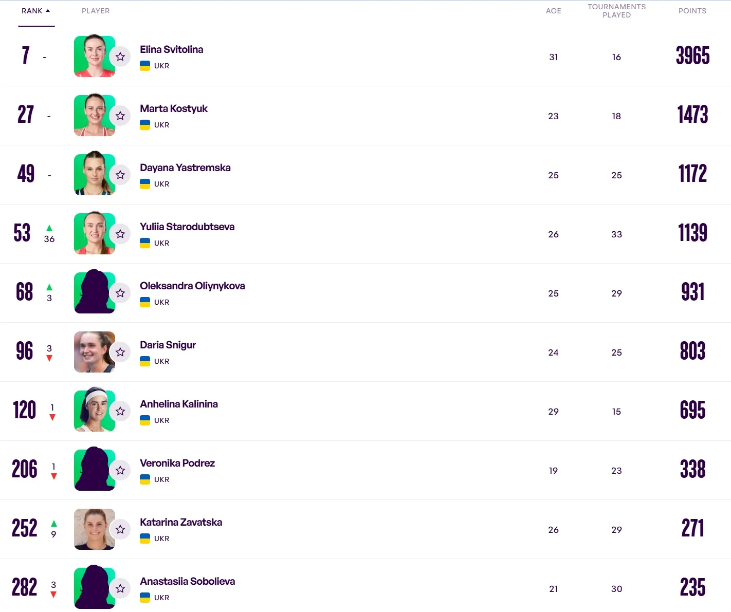 Даяна Ястремська посідає 49-ту позицію (1172 очки). Юлія Стародубцева стала четвертою ракеткою України, здійснивши ривок на 36 місць. У неї тепер 53-й номер у світі та 1139 залікових балів. Нагадаємо, на минулому тижні Стародубцева дійшла до фіналу турніру серії WTA 500 у Чарльстоні (США).