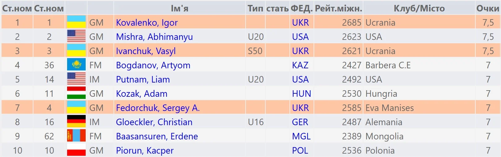 До топ-10 потрапив ще один представник України. Сергій Федорчук поділив 4–20 (!) місця, маючи 7 очок, та став сьомим за додатковим коефіцієнтом.