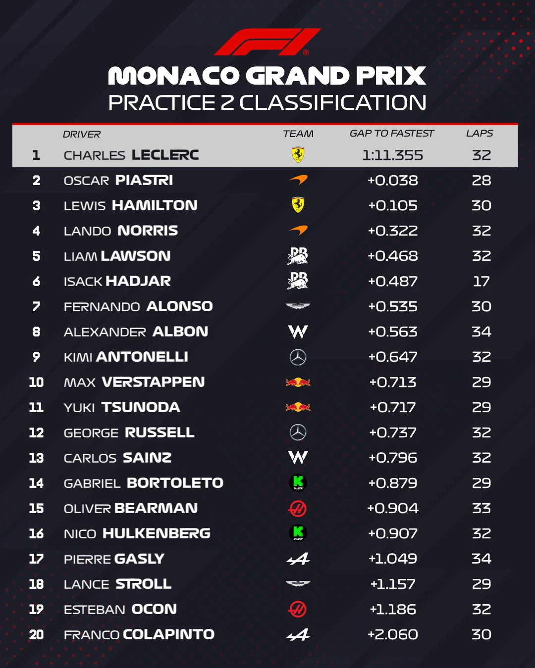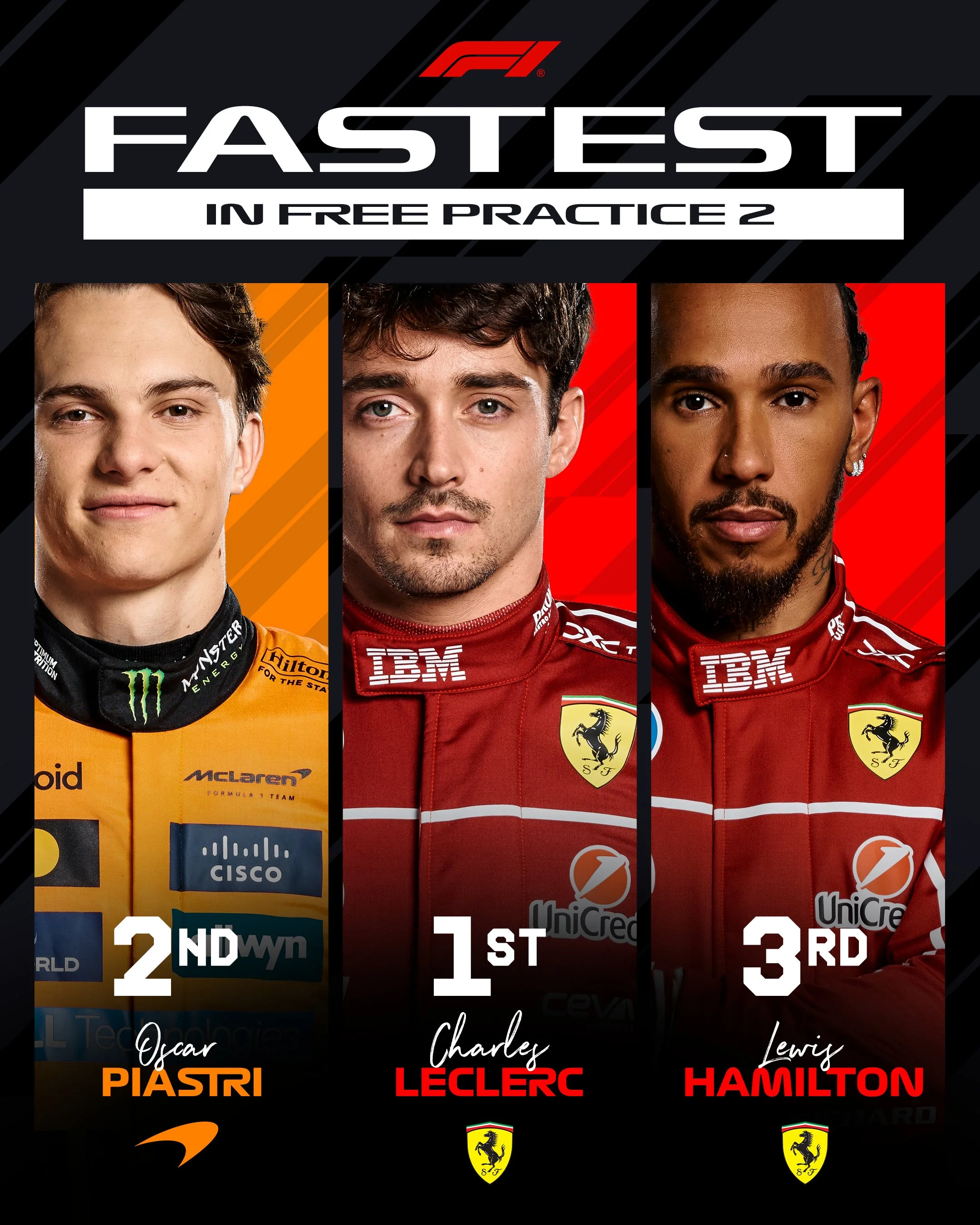 Якщо за підсумками першого тренування пілот Феррарі залишив позаду себе в трійці найкращих чинного чемпіона світу Макса Ферстаппена та Ландо Норріса, то в топ-3 другої практики в нього виявилися інші конкуренти. Другим став лідер нинішнього сезону Оскар Піастрі з Макларена, а третє місце дісталося Льюїсу Хемілтону з Феррарі, який останнім часом перебуває під вогнем безперервної критики.