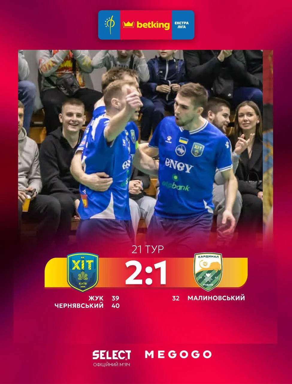 Першими відзначилися гості – Артем Малиновський вивів Кардинал уперед, перегравши Олександра Сухова. Після пропущеного голу гравці ХІТа влаштували справжню облогу воріт гостей, яка принесла яскравий камбек на останній хвилині. Спочатку Євгеній Жук відновив рівновагу, а потім Ігор Чернявський приніс київській команді перемогу – 2:1.