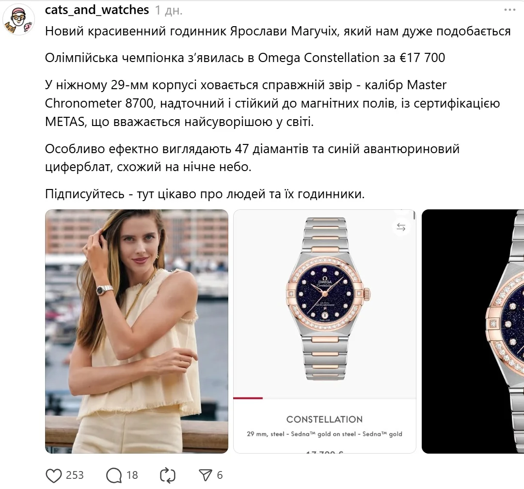 "У ніжному 29-мм корпусі ховається справжній звір – калібр Master Chronometer 8700, надточний і стійкий до магнітних полів, із сертифікацією METAS, що вважається найсуворішою у світі. Особливо ефектно виглядають 47 діамантів та синій авантюриновий циферблат, схожий на нічне небо", – повідомив Threads-аккаунт Cats and Watches.