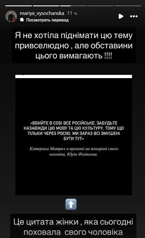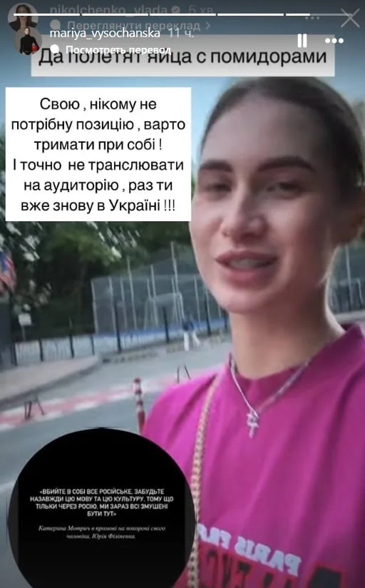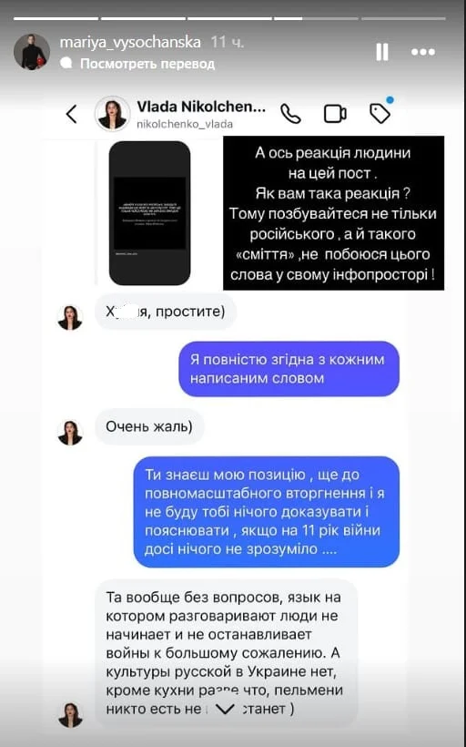 Але (повертається на російську) проблема не в цьому. Проблема в тому, що оцим насильницьким "переходимо на українську мову, та ви взагалі…", розпалюванням конфлікту — ви самі відбиваєте людям бажання переходити на будь-яку мову. Ви це розумієте? Це просто жах якийсь, чесно. Мене сьогодні це дуже вибісило. Не будемо тицяти пальцями, але це вже не вперше. Я відписалась від людини, і мені стало легше. Я вам виговорилась, хай понесеться хейт, а я пішла собі їсти. Всім гарного вечора", – заявила Нікольченко у першій серії сторіз. Височанська попросила її не транслювати на аудиторію свою "нікому не потрібну думку", але Владу вже було не спинити.