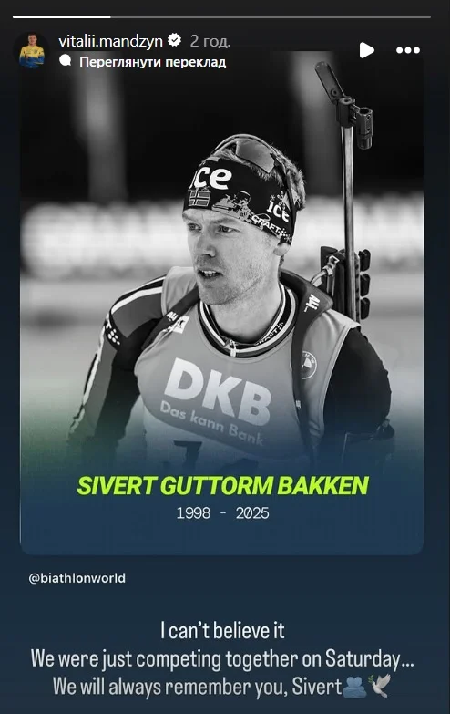 "Не можу в це повірити. Ми ж лише в суботу разом змагалися... Ми завжди пам’ятатимемо тебе, Сіверте", – на трагедію відреагував і український біатлоніст Віталій Мандзин.