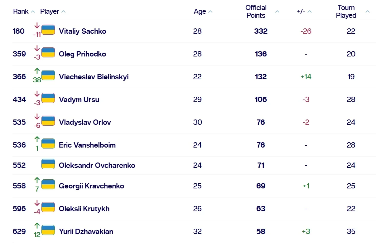 В’ячеслав Белінський додав до свого рейтингу одразу 11 позицій та злетів на 366-те місце у світовому рейтингу. Він має статус третьої ракетки України.