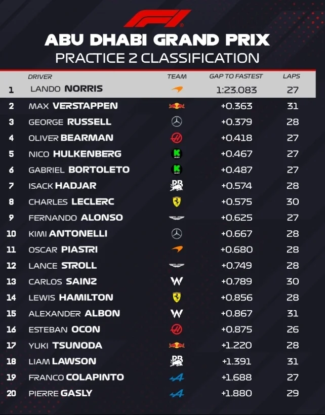 У другій практиці найкращим знову став гонщик Макларен Ландо Норріс. Він покращив свої показники (1:23,083) і випередив Ферстаппена вже на 0,3 секунди. Натомість Піастрі видав лише 11-й час. Пілоти Феррарі – Шарль Леклер та Льюїс Хемілтон продемонстрували 8-й та 14-й час відповідно.