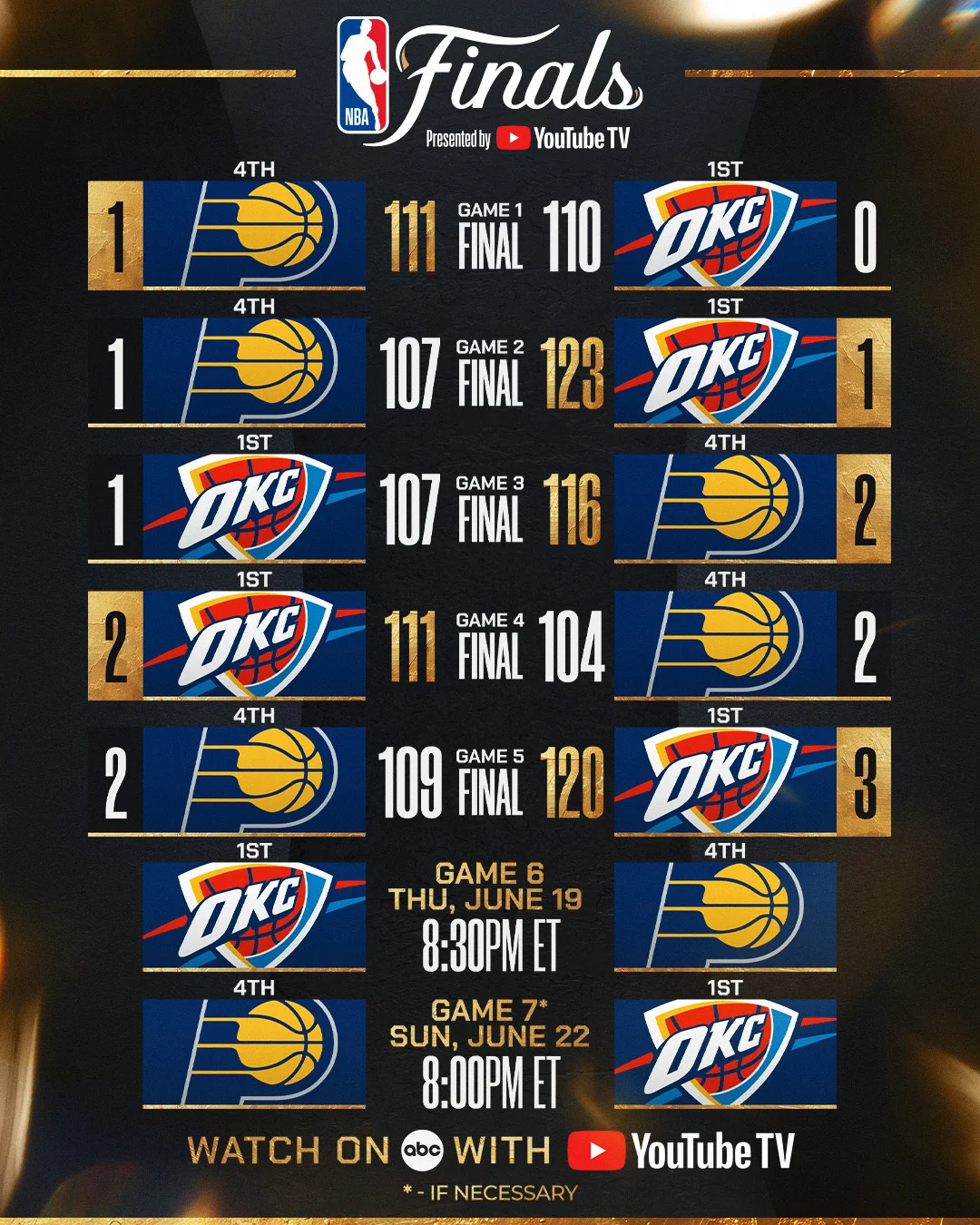 Шосту гру серії команди проведуть в Індіанаполісі в ніч на 20 червня. Вона може стати фінальною в серії в разі перемоги Оклахоми.