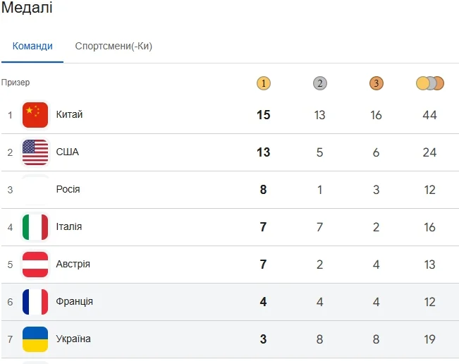 "Синьо-жовті" здобули 19 комплектів нагород (3 золотих, 8 срібних та 8 бронзових) – більше лише в Китаю та США. Проте в медальному заліку спершу враховуються золоті та срібні медалі, тому за цим показником Україна поступилась ще чотирьом командам.