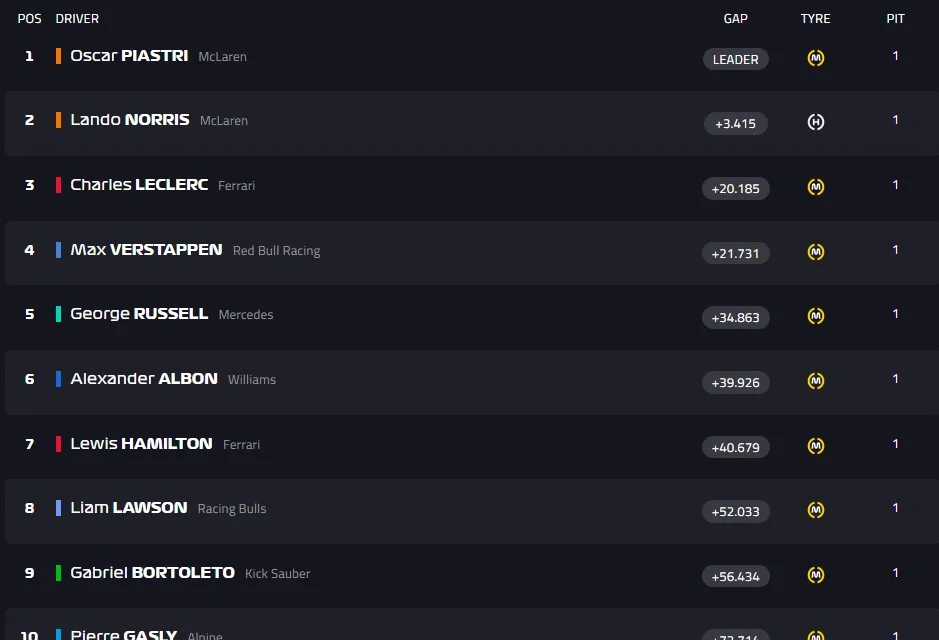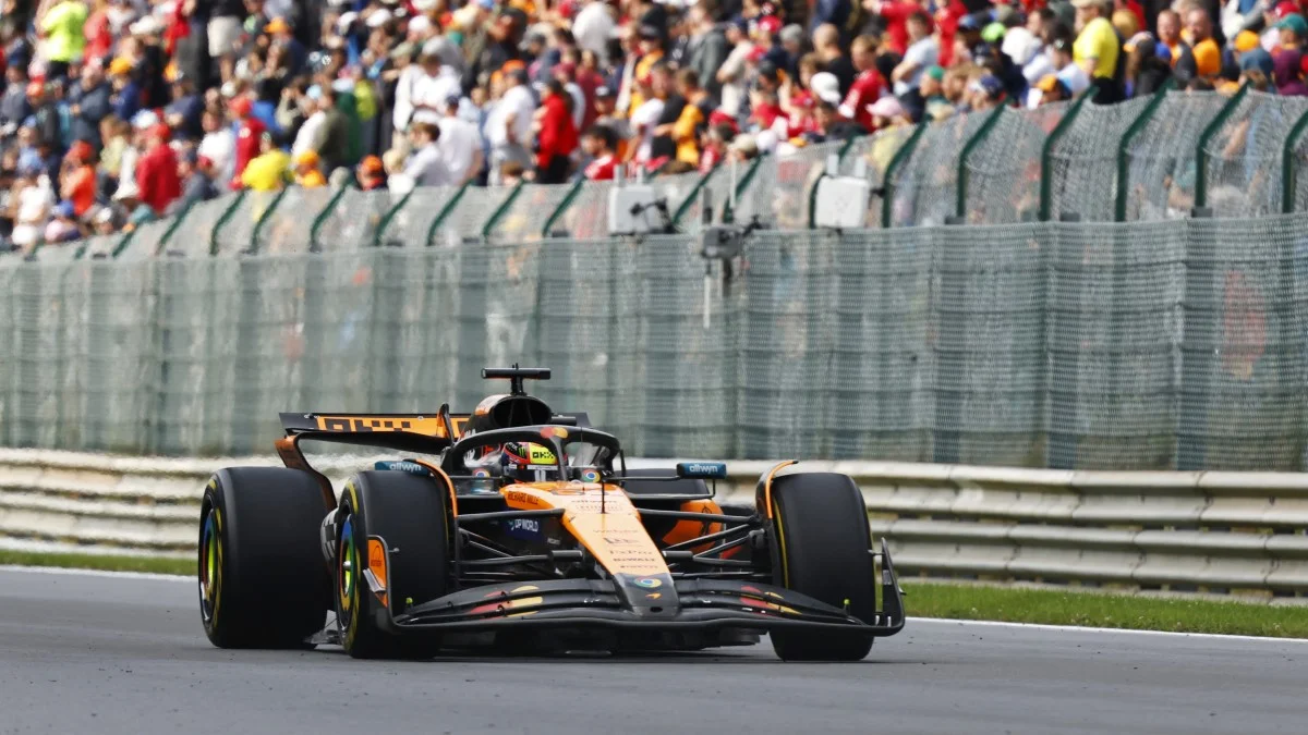 Початок перегонів на Гран-прі Бельгії був вимушено перенесений на понад годину через сильну зливу. Ландо Норріс з Макларена став переможцем кваліфікації і стартував першим, однак уже на початку поступився своєму партнеру по команді Оскару Піастрі.