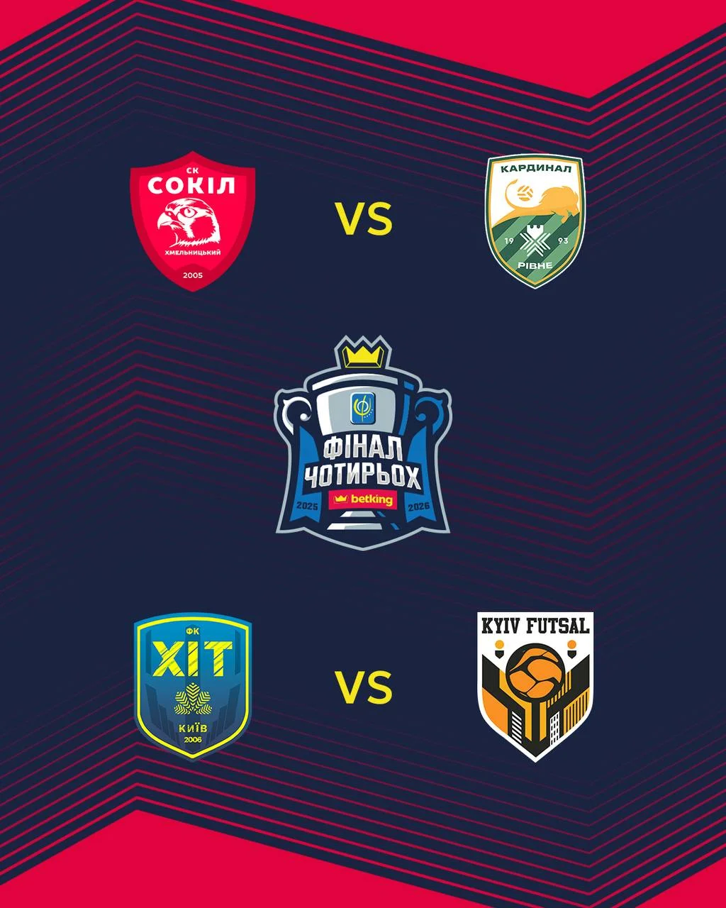 У матчах 1/2 фіналу зустрінуться: Сокіл Хмельницький – Кардинал Рівне, ХІТ Київ – Київ Футзал.