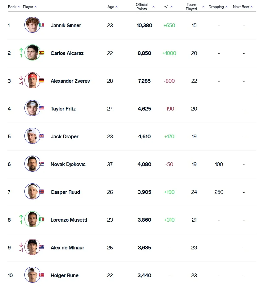 Першою ракеткою світу, як і раніше, є італієць Яннік Сіннер. Іспанець Карлос Алькарас після перемоги на тисячнику в Римі (Італія) піднявся на друге місце, звідки потіснив німця Александра Звєрєва.