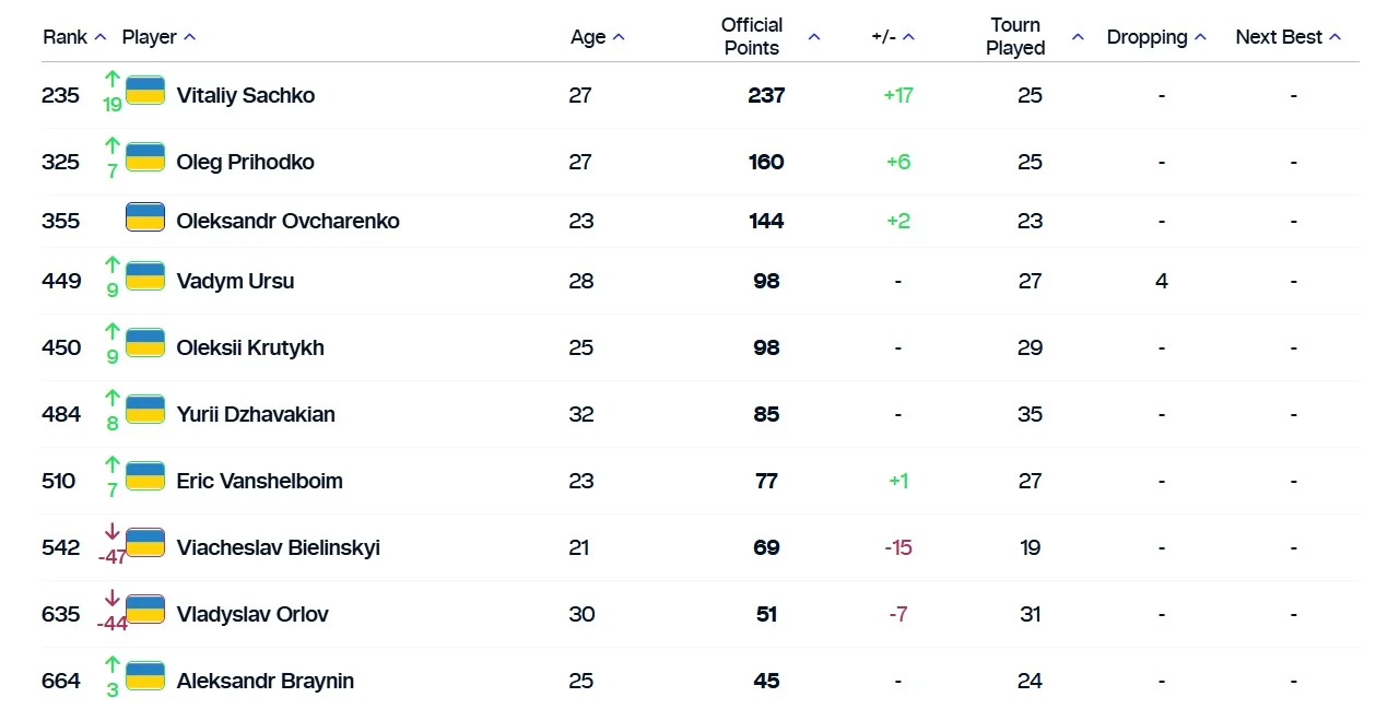 Також до топ-500 входять Вадим Урсу, Олексій Крутих та Юрій Джавакян. Усі вони в оновленому реєстрі домоглися прогресу.